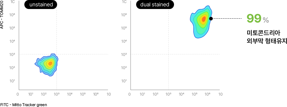 분리된 미토콘드리아 중 99%의 외부막이 손상되지 않고, 온전한 형태를 잘 유지하고 있음을 확인